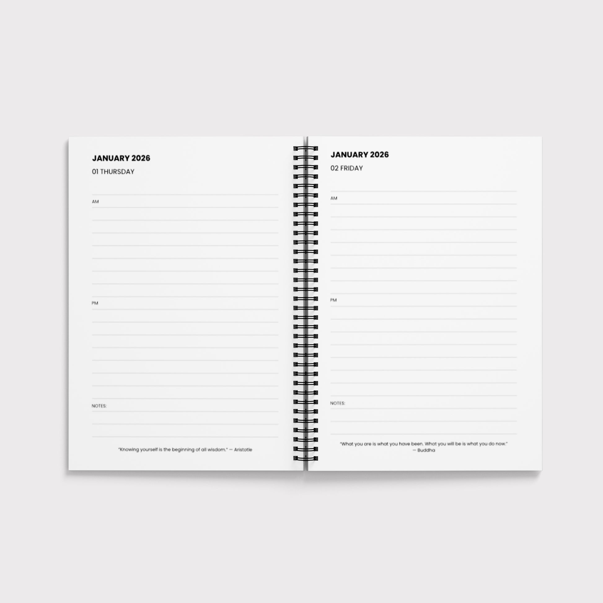 The 2026 Daily Diary Planner redefines the classic one-page-per-day style with a modern twist, blending timeless functionality with thoughtful features. Perfect for daily planning and journaling, it includes tools like a vision board, monthly planning & reflection pages, and inspiring motivational quotes to keep you focused and uplifted. With a Sunday half-day layout for flexibility, essential info pages, this diary is crafted to help you organize your thoughts, plans, and goals with elegance and ease.
